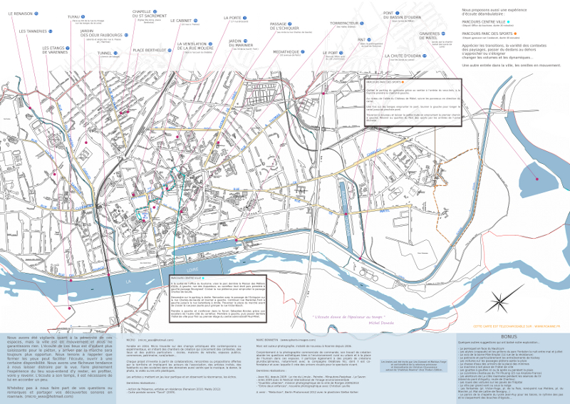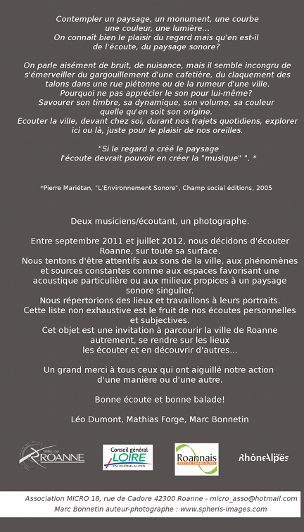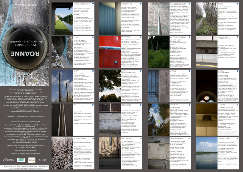 A l’initiative de MICRO association, le projet « cartographie sonore de la ville de Roanne » a permis de réaliser une carte de découverte de la ville au travers des sensations sonores recueillies par deux musiciens/écoutant et un photographe. Cette carte propose d’explorer la ville avec les oreilles en indiquant une vingtaine de lieux « remarquables » et deux parcours d’écoute. Projet soutenu par la Région Rhône-Alpes, Roannais Pays de Rhône-Alpes, le Conseil Général de la Loire et la Ville de Roanne.